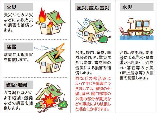 台風や強風や雹や大雪など、自然災害によって突然発生した損害が補償の対象になります。